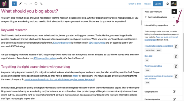 Now that we have analyzed your content, we can give you internal linking suggestions. The internal linking tool for WordPress is located in the Yoast sidebar of your page and post editor (see image below).