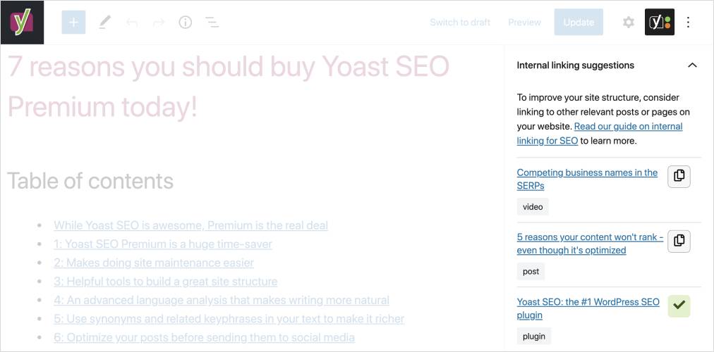 Internal linking helps search engines find your pages and shows them that certain content is related. The internal linking suggestions in Yoast SEO Premium save you time by suggesting relevant blog posts you can link to. Check out how the tool works in this video: