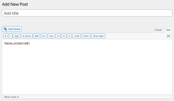 Yoast can output breadcrumbs with a shortcode on a site’s posts, pages, and taxonomies. If you are using the block editor, you will need to insert a shortcode block and add the following code: