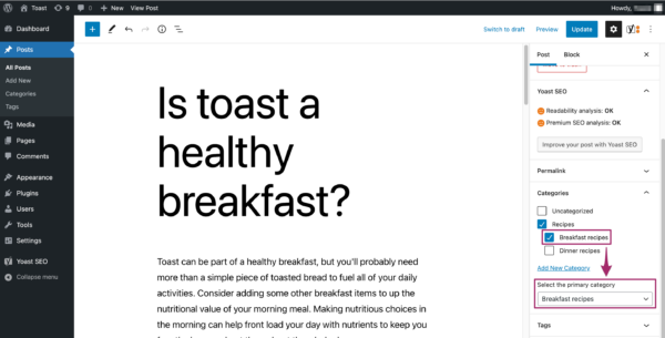 1. Select a subcategory and be sure to mark it as primary. In the example image below, the subcategory (also called a child category) “Breakfast recipes” was selected.