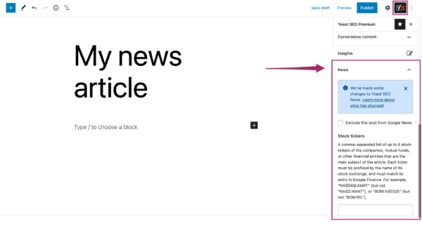 Once you set up News SEO, you can start using it for your articles. While writing your article, you can find the News SEO settings in the Yoast SEO sidebar.