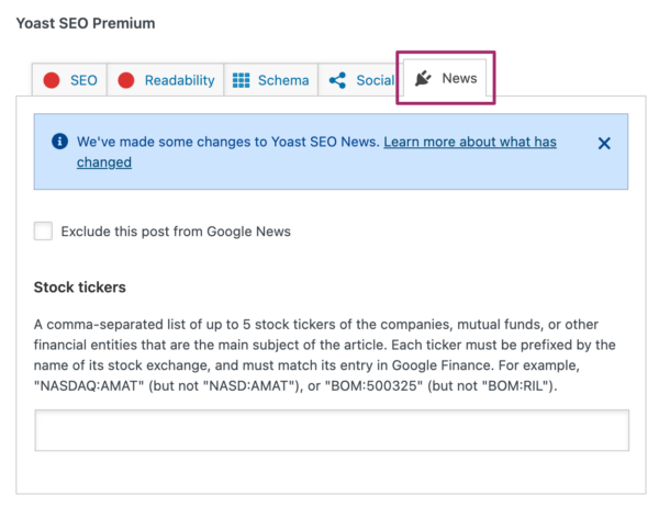 The News SEO plugin for Yoast SEO helps you do all the things that allow you to optimize your site for Google News. It creates XML News Sitemaps so Google can pick up on new articles as soon as possible, and it helps you optimize some of the more advanced XML News sitemap options like stock tickers.