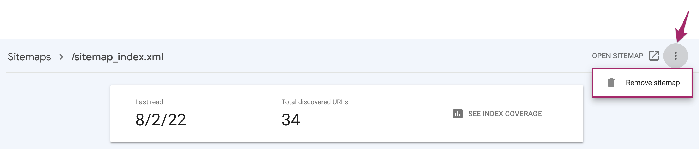 - Click on the 3 vertical dots in the top-right of the page then Remove Sitemap. If needed, you can then re-add the sitemap here.