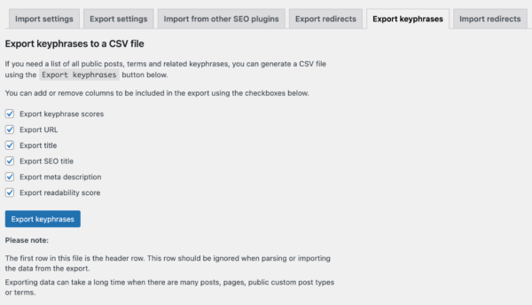 Lastly, you can also export your keyphrases if you’re using the premium version of the plugin. The plugin allows you to generate a CSV file that lists all of your public posts, terms, and related keyphrases. On this tab, you can add or remove columns to be included in the CSV file, by selecting checkboxes. You can choose to include keyphrase scores, URLs, titles, SEO titles, meta descriptions, and readability scores. This feature can come in handy if you want to work on these in another location.