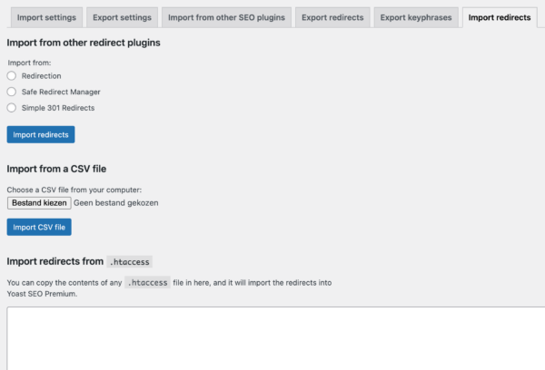 If you’re using Yoast SEO Premium, you can also import and export redirects. There are three ways of importing redirects: from other redirect plugins, from a CSV file, or from a .htaccess file. You can export your redirects to a CSV file. This might be useful if you want to transfer your redirects to another site, for example when you’ve moved your site.