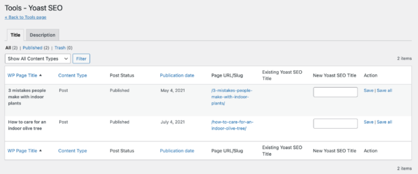 For example, on the title tab, you’ll find an overview of all the posts and pages on your site, with information about your post or page and a field where you can enter the new SEO title for that specific post or page. Every post or page is on a separate row, so you can edit the SEO titles of all of your posts and pages easily in one overview.
