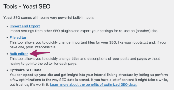 You can find the Bulk editor tool by going to your WordPress backend, clicking “Yoast SEO” and then “Tools” in the menu on the left-hand side. On this page, click “Bulk editor”.