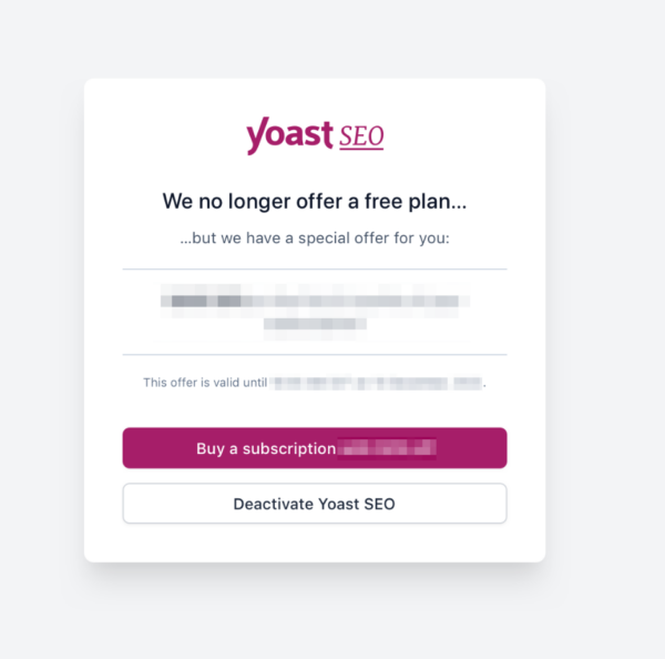 If you decide not to upgrade to the Yoast SEO subscription, you can deactivate Yoast SEO. Clicking the “Deactivate Yoast SEO” button will remove all theme modifications by Yoast SEO. After that, you can delete Yoast SEO.