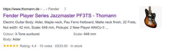We’ll also add structured data with Schema.org, so your content will get an increased chance to show up in search engines as rich results. Structured data gives search engines rich information about your pages and your site. That makes it easier for them to show the right content in the results and display it better. For instance, in the example below, the rich result includes details about the product such as color, body, ratings, price, and availability.