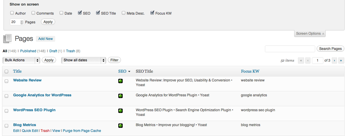 But, more importantly, it’s also shown in the overview of posts and pages, alongside other key SEO info (click for large version):