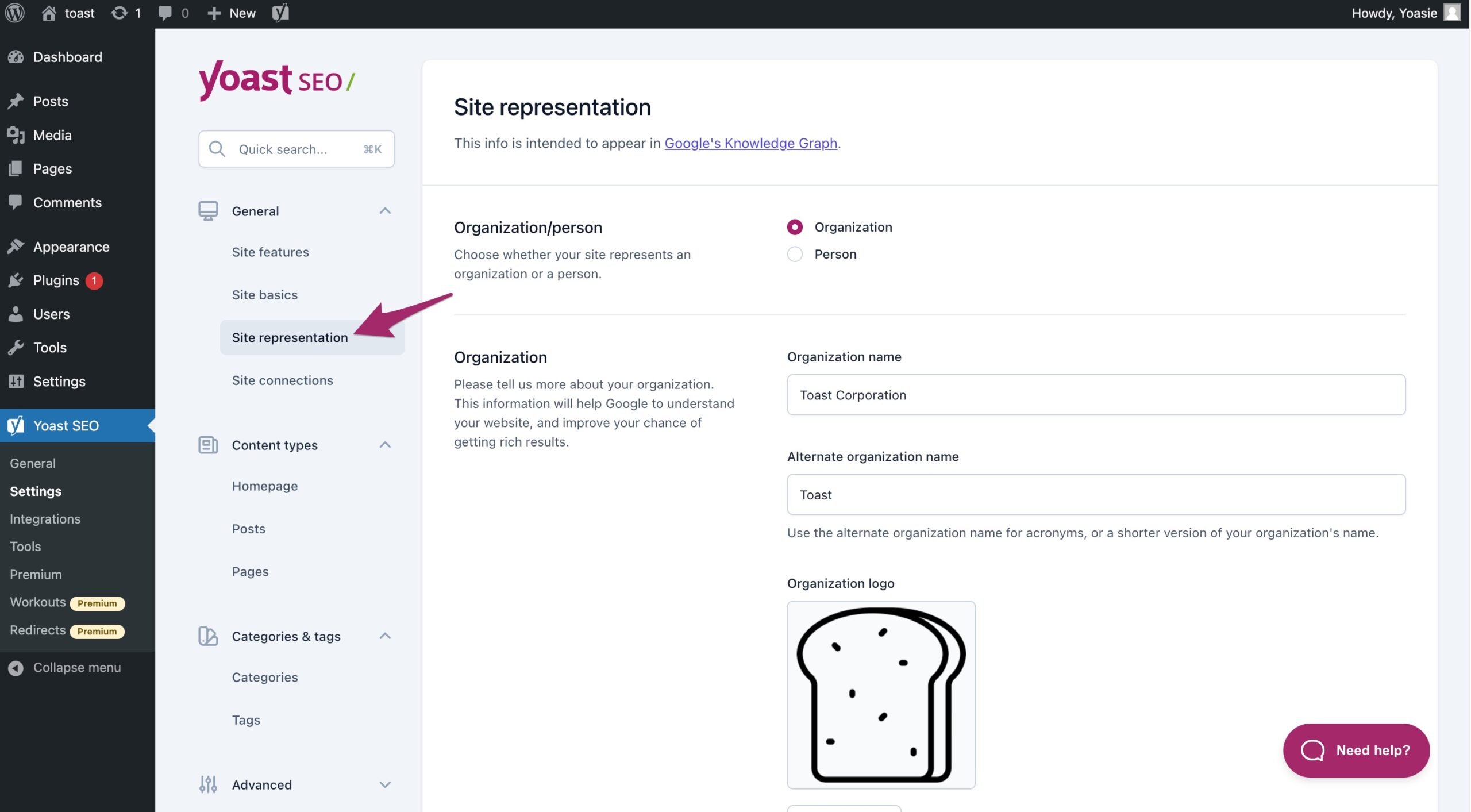 In the Yoast SEO settings menu, click “Site representation”. You can only verify your site on Mastodon with Yoast SEO if your site represents an organization, so if you have selected “Organization” at the top of the Site representation settings.
