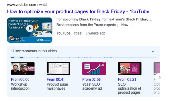 Key moments are additional links that appear in the Google search engine results pages (SERPs) underneath your video listing. These act as ‘chapters”, directing users to different sections of your video.