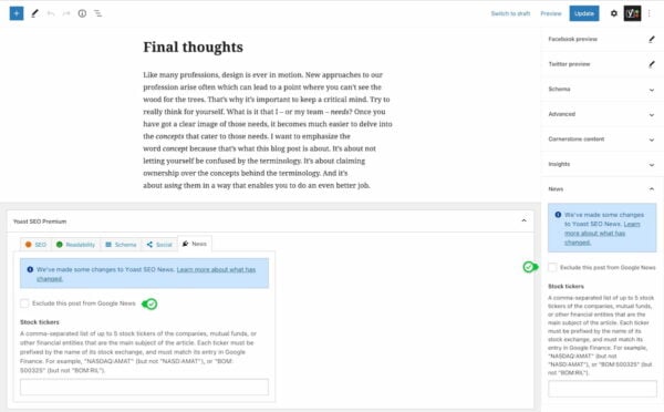 The News SEO add-on for Yoast SEO now works in the sidebar as well as the meta box