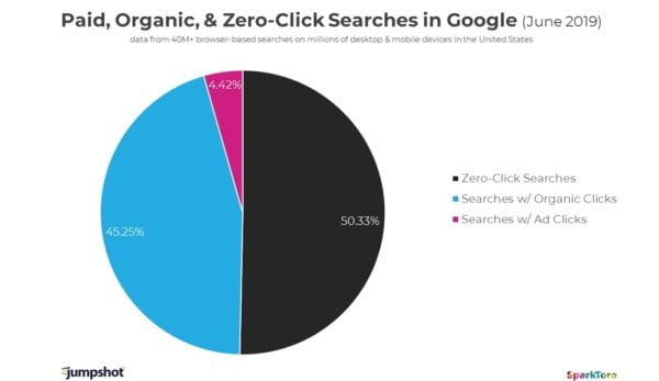 Rand Fishkin of SparkToro has been tracking developments in Google for a long time. One of his works is researching the changes in how people search and where the clicks go, based on data by an analytics firm. From his recent reports emerges an interesting trend: less than 50% of all the searches lead to a click! These are the so-called zero-click searches.