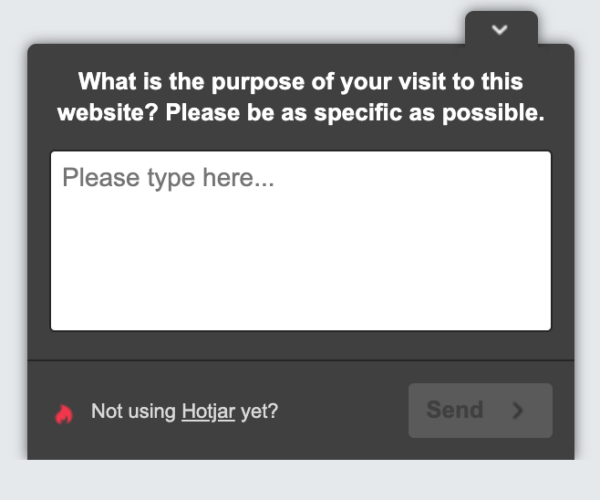 This pop-up will appear at the bottom right of the website, no matter what the landing page is. The above use of wording encourages visitors to really think about their specific purpose. Also the addition of ‘be as specific as possible’ often results in more valuable answers.