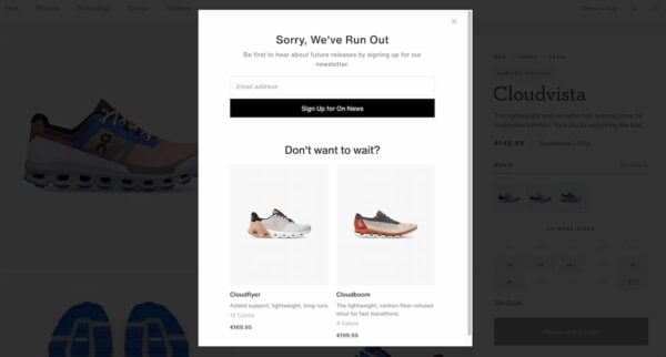 Clicking on a greyed-out size for this particular shoe opens up this modal that asks customers to keep up to date