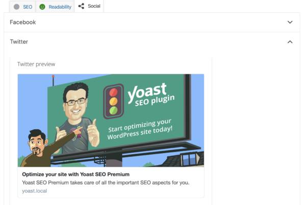 With Yoast SEO, you can effortlessly control what your posts look like when you share them on Twitter. Yoast SEO fills in the Twitter card with the information you provide in your post or page. In the Social tab of the Yoast SEO meta box, you can also manually add an image, a title, and a description. Our Premium plugin contains Social Previews which display what the Twitter Card will eventually look like based on the current page or post.