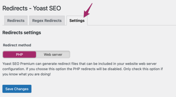 You can find the redirect settings tab by going to your WordPress backend, clicking “Yoast SEO” and then “Redirects” in the menu on the left-hand side. Here, click the “Settings” tab.