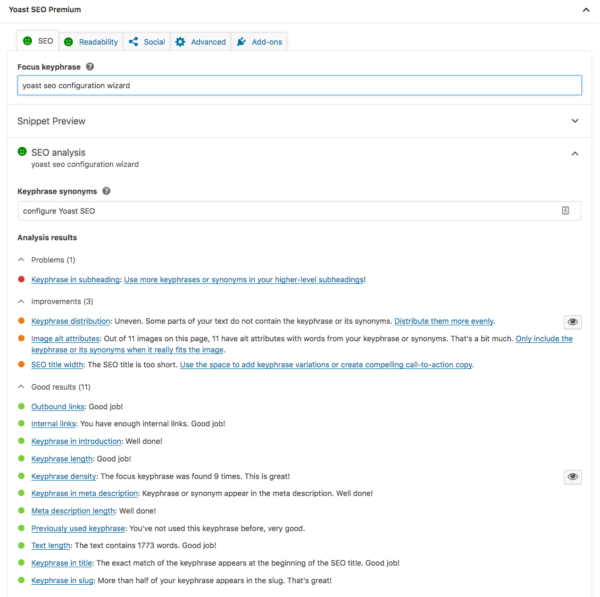 Yoast SEO can help you tweak your text, we like to call that process ‘Yoast your post‘ ;-). The red and orange bullets will indicate which aspects of your findability need attention. For example, the plugin might suggest using your focus keyword a little more often, perhaps by putting it in the first paragraph or in one of the headings. Yoast SEO will help you to optimize your snippet preview as well. In short: don’t just set the plugin and then forget about it, but use it to your advantage!