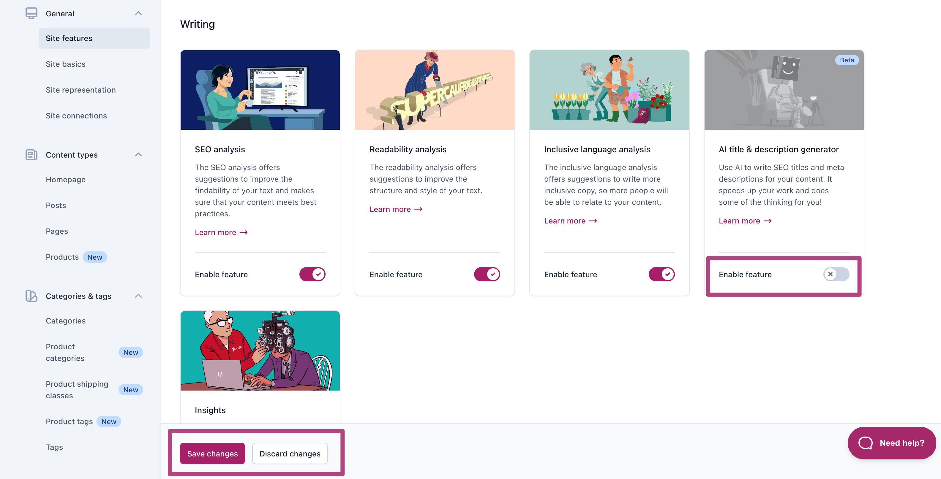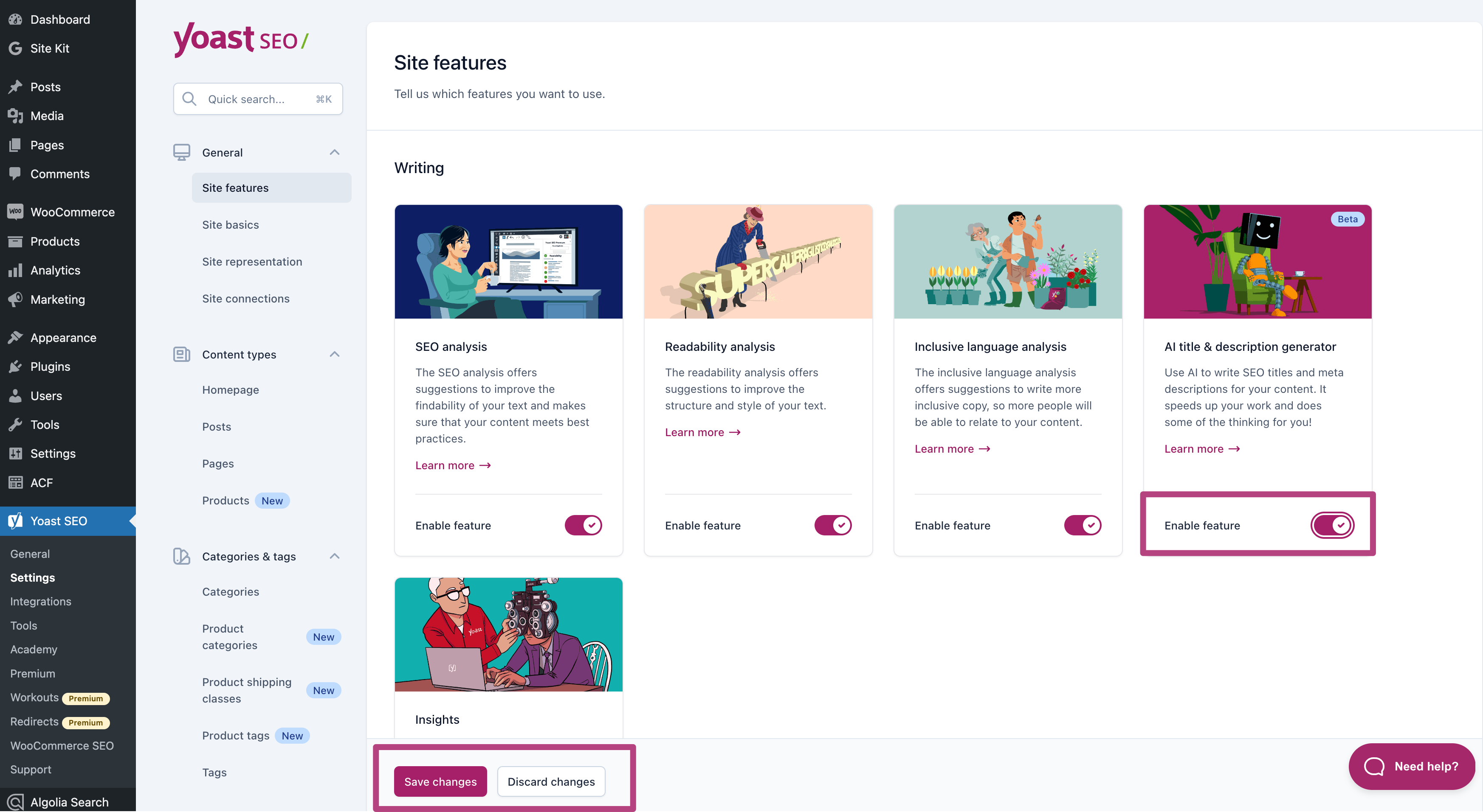 under ‘Site features’ in the Yoast SEO Settings menu, click on ‘Enable feature’. This will turn the AI generator back on. Click on the ‘Save changes’ button that automatically pops up to save your changes.