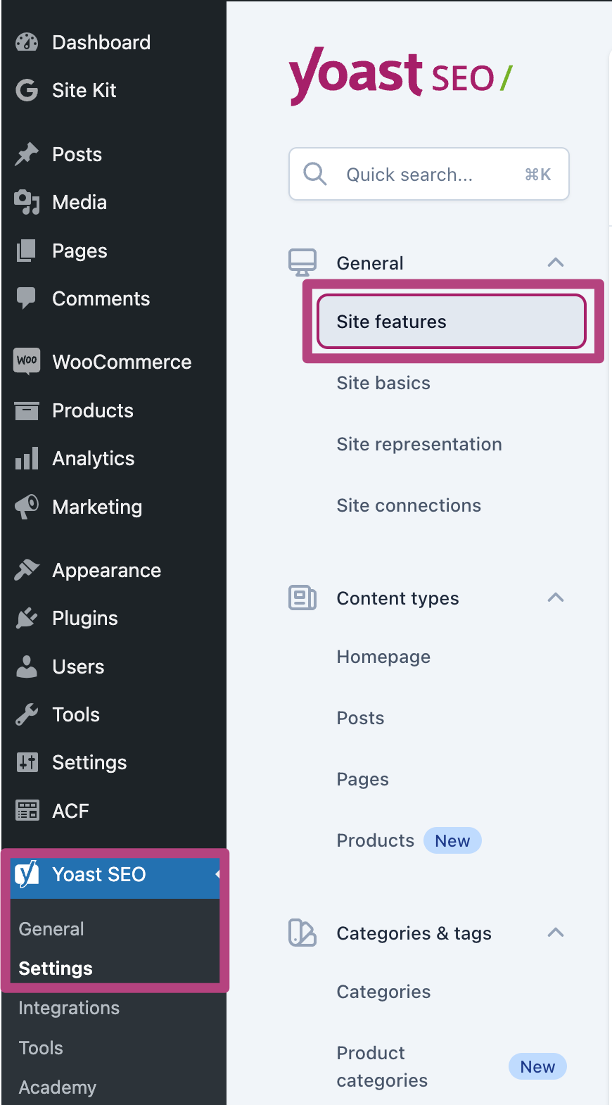 In your WordPress dashboard, go to the Yoast SEO Settings and click on Site features.