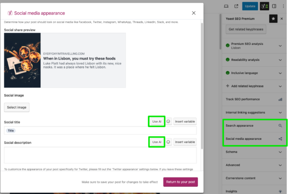 If you want to use AI to generate an SEO title or meta description, open the Yoast SEO metabox and go to Search appearance or Social media appearance to locate the “Use AI” button there.