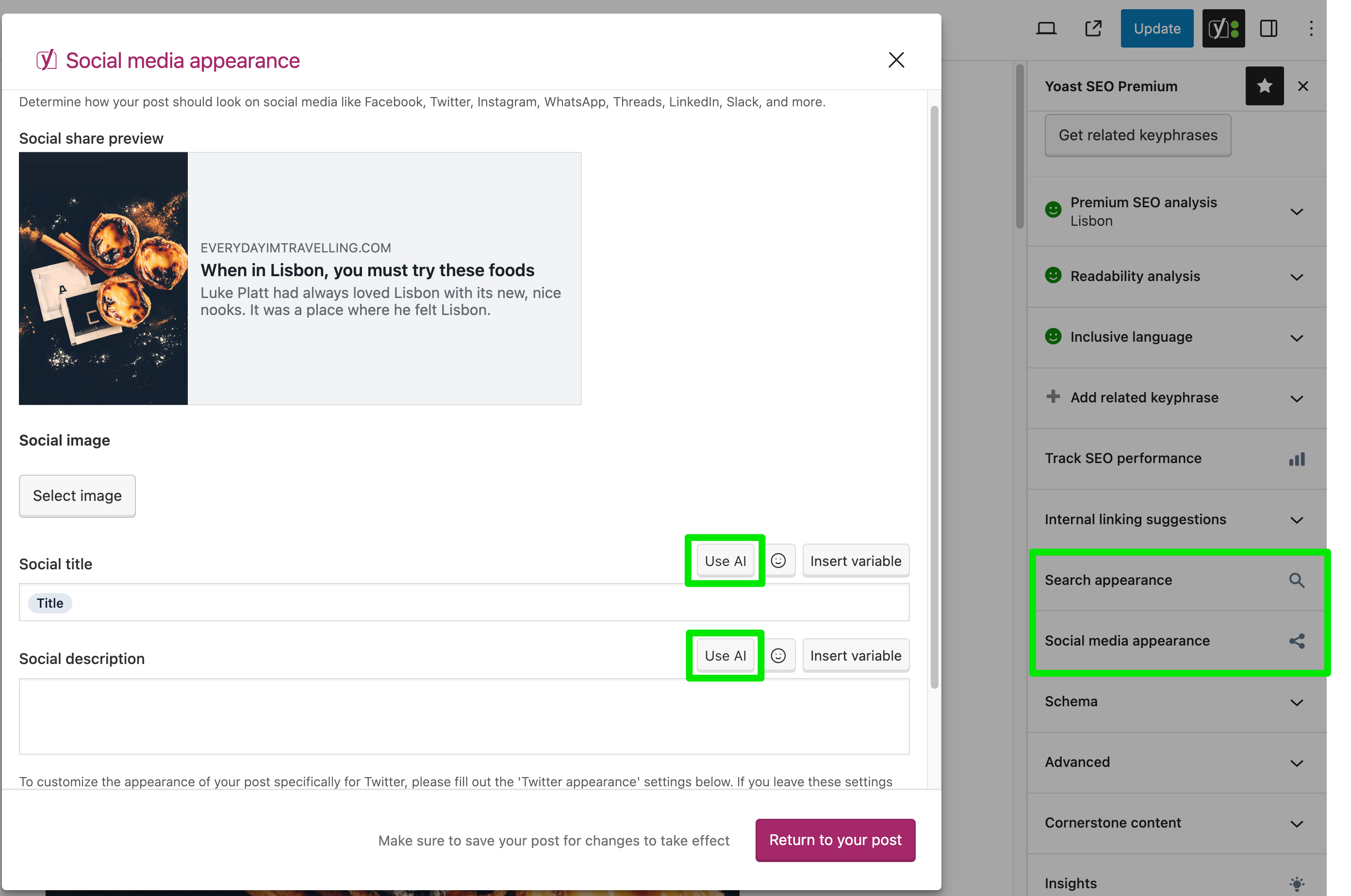 If you want to use AI to generate an SEO title or meta description, open the Yoast SEO sidebar and go to Search appearance or Social media appearance to find the “Use AI” button there.