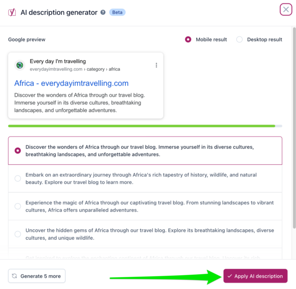 Five options are generated for you. If you’re happy with the results, pick one and click the button called “Apply AI title” or “Apply AI description” in the bottom-right corner of the window. This will apply the title or description to your content automatically.