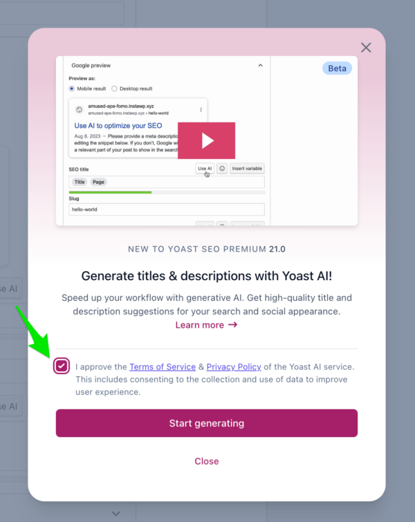 Our AI features use external services, so you must check the button to approve the Terms of Service and Privacy Policy of the Yoast AI service and click the button “Start generating”. You only need to approve these once. Please be aware that granting consent will result in your data being transferred for the AI functionality.