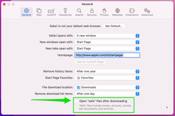 Unchecking this box ensures Safari doesn’t open “safe” files after downloading automatically.