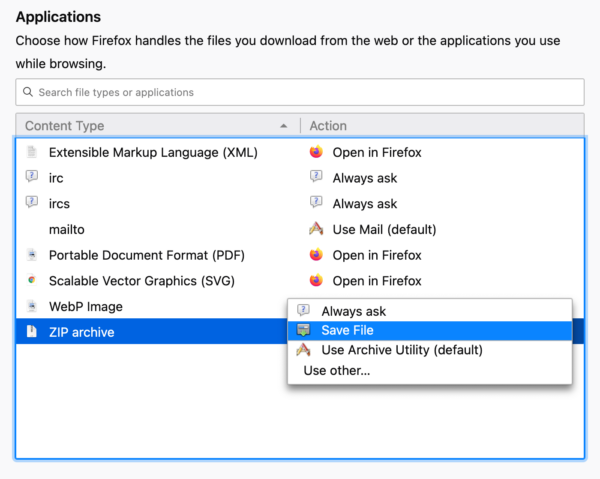 By default, Firefox does not automatically open .zip files. If you’re using Firefox and it is still doing this, you need to follow the steps below to change this behavior.
