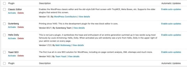 WordPress 5.5 offers the possibility to enable auto-updates for your plugins. Please note that if this is something you want to use, you have to enable it yourself for each plugin. Go to your admin dashboard, click on “Plugins” in your menu, and click “Enable auto-updates” next to every plugin you want to have automatically updated.