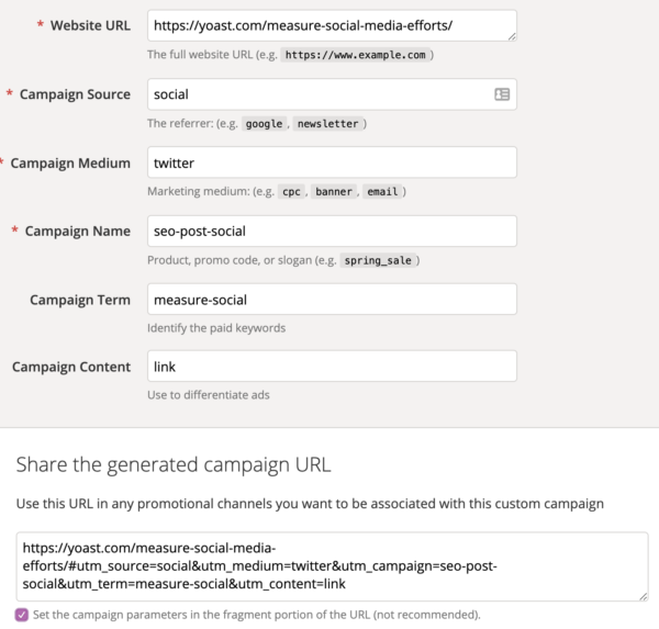 At Yoast, we use a # to start off the UTM tag, but most tools use a ?. We use the # because then we know for certain that we are not causing duplicate content since Google ignores anything after the #. So let’s break down this UTM tag, shall we?