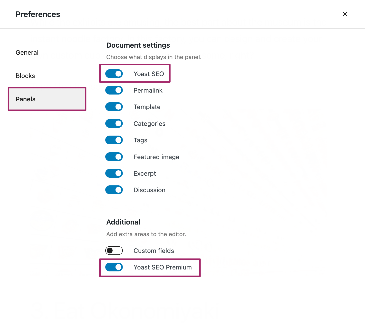 - Click on ‘Panels’ and switch the ‘Yoast SEO’ or ‘Yoast SEO Premium’ toggle on.