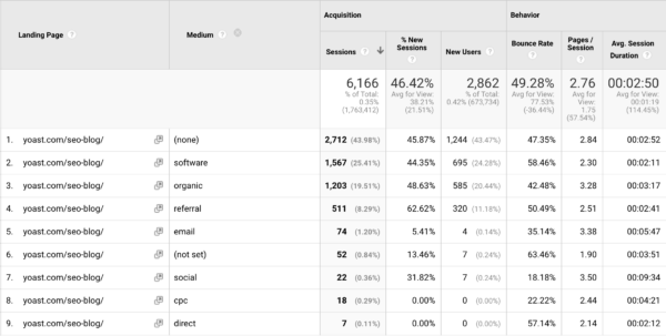 I then dove in further, clicked on the page and added a secondary dimension: medium, so I could quickly see where traffic is coming from. I noticed that we have a lot of traffic that we don’t know the source of. So that’s something to explore further. In second position comes our plugin and third is organic search traffic. Which is interesting to see because I’m curious with what keywords people end up on that page and if we rank properly on that keyword or keyphrase. With that information, we can improve the SEO of that page even further.