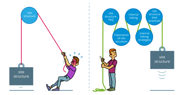 Imagine you want to rank with the keyphrase [site structure]. That’s a rather competitive keyphrase. If you’re just starting out in blogging about site structure, it might be hard to rank for that term. A great strategy is to write different articles each focussing on a different aspect of site structure, for example: [site structure FAQ], [internal linking], [site structure best practices]. These search terms are less competitive and these articles will each drive some traffic to your website. However, how do you make sure that Google knows which article is most important?