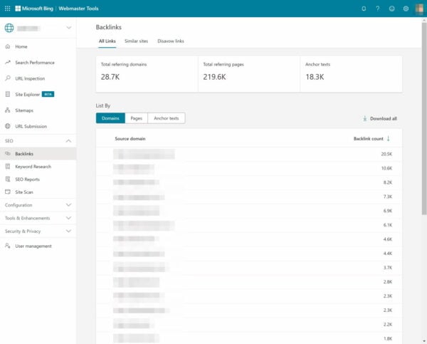 At a glance, Bing Webmaster Tools’ Backlinks report looks unimpressive. It simply provides a list of websites that link to yours, ordered by the total number of links. But because some sites might link to yours a lot, that tends to mean that sites with lots of pages (and/or sites with a site-wide link to yours) tend to show up above others which might be more ‘valuable’.