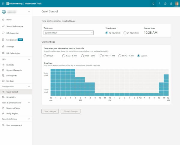 We’ve covered off the main reports and tools, but there’s more tucked away in Bing Webmaster Tools’ menus. For example, there’s a handy Crawl Controls interface, which lets you manage how (and how much) Bing crawls your website, with an intuitive time-and-day visualization.