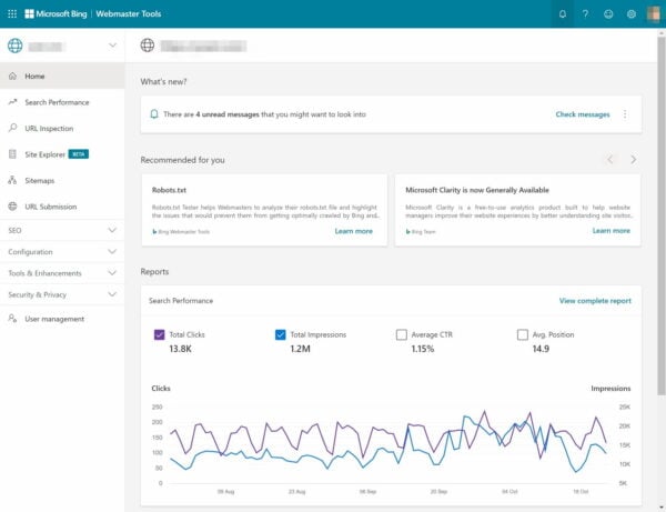 Perhaps the most valuable section of Bing Webmaster Tools is the Search Performance report. Similar to the “search results” section in Google Search Console, there’s an overview of your clicks, impressions, and other key metrics.