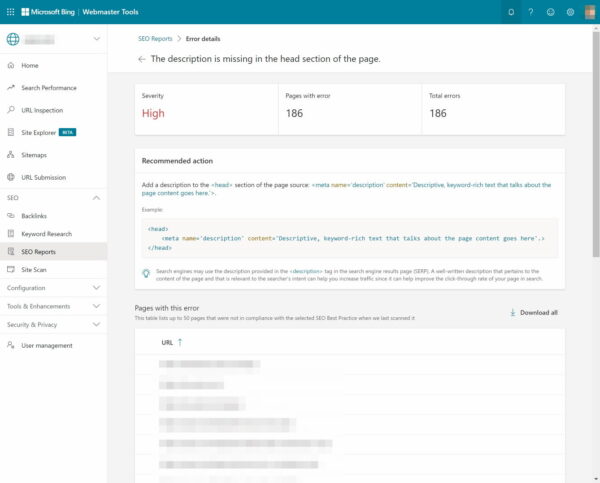 The “Missing meta description” section of the “SEO Reports” section of Bing Webmaster Tools.