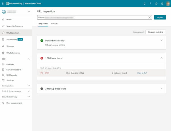 Like Google’s URL inspection tool, Bing allows you to perform spot-checks on individual URLs and pages to see them in the way that Bing sees them. You can also switch between a live check, and seeing Bing’s currently indexed view of the page.