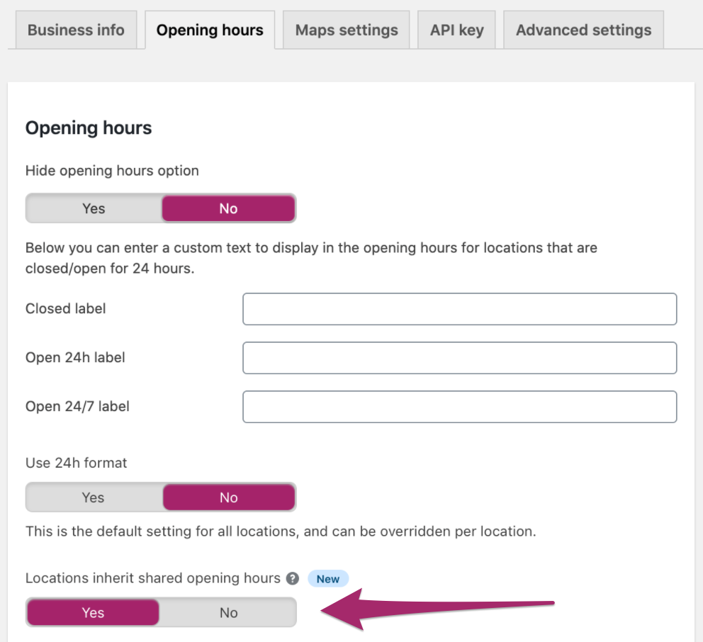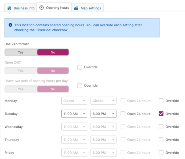 - Switch the toggle “Locations inherit shared opening hours” to “Yes”.