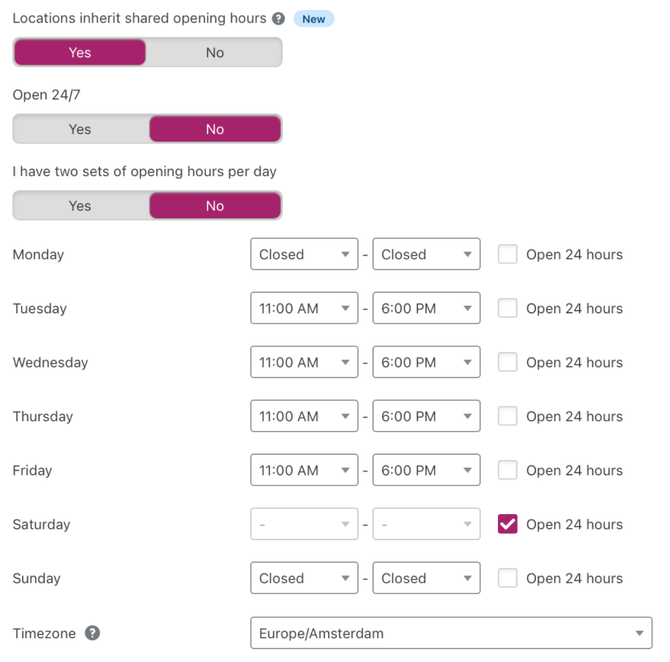 Shared opening hours only work when you have selected that all of your locations are the same company. So, with this feature, you can quickly fill out opening hours that are the same for more of your locations. These opening hours will then be shared with all other locations that don’t already have opening hours set. The Local SEO plugin uses the opening hours to output the correct site-wide LocalBusiness schema.