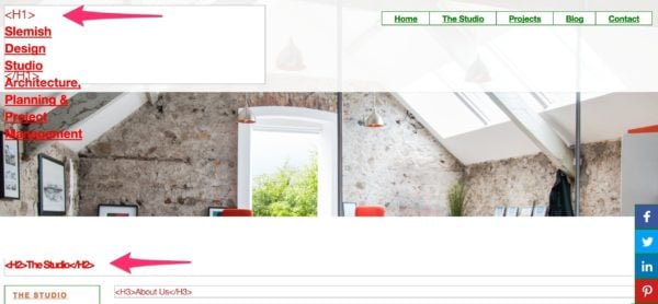 Your company name/logo has an H1 tag now, which means that your company name would be the main subject of this page. While in fact, ‘The studio’ is the main subject of the page. So you should change the H2 heading of ‘The studio’ into an H1 heading. Just remove the H1 heading from the logo on every page of the website. We’d advise to check all of your pages and posts and only add one H1 heading, that describes what can be found on there, on each page.