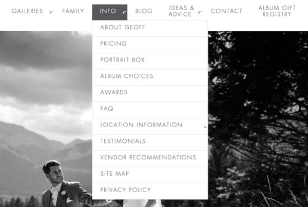Looking at the menu of the website, we believe there are too many options. To provide a good user experience, visitors need to find in a few seconds what they’re looking for. Offering too many choices makes this harder. Geoff could, for instance, consider cutting down the number of sub items in the drop down menu of ‘Info’.