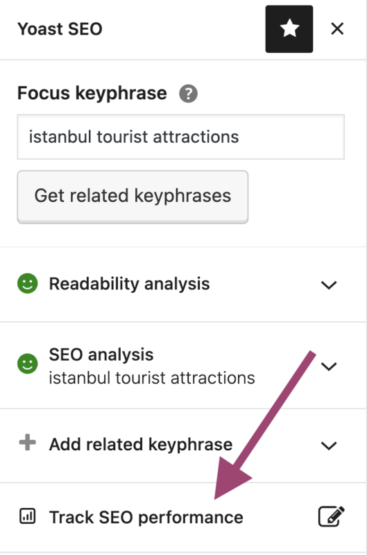 - Open a published post or a page and go to the ‘Track SEO performance’ tab in the sidebar or the meta box.