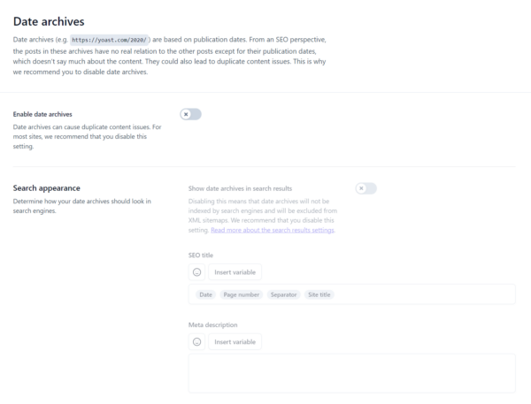 Currently, at Yoast we have date-based archives enabled because we’re in the process of cleaning up old posts. This is one reason why you could consider enabling it in the settings. It’s a good method to use you’re about to do a spring cleanup! Just remember to not link to it from any of your pages.