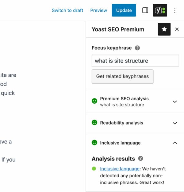 The third analysis that you can find in Yoast SEO is the inclusive language analysis which gives you feedback on any potentially non-inclusive words or phrases you’re using in your text. We at Yoast strongly believe that you should inclusive language in your content. Because creating inclusive content is good for both your users and SEO. Wondering how that works? Read more about it in our post on inclusive language and SEO.