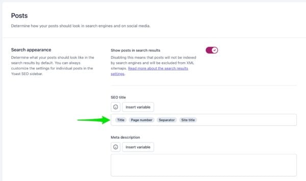 In addition to the separator of your SEO title, you might also want to change how your SEO titles are set up. Simply go to Content types, click on Posts or any other content type (depending on which one you want to change) and go to Search Appearance. Here you can change how our plugin sets up your titles and meta descriptions. Set up by using snippet variables that tell the plugin what the title of your post is or the separator of your choice.