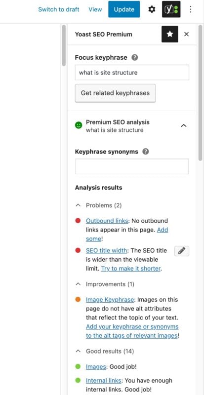 When you’ve added a keyphrase (and ideally a bit of content), Yoast SEO is able to run the SEO analysis. This analysis evaluates how well your content is optimized to rank for that keyphrase. For instance, it checks whether you’ve used the keyphrase enough and not too often. But also whether it’s in your SEO title, meta description, images, or subheadings. Moreover, it checks other SEO aspects of your content that are not related to your keyphrase, for instance, if you have any internal links to other articles on your website which is also important for search engines to understand your content.